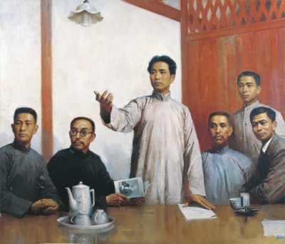 在党的“一大”会议上。 陈逸飞、邱瑞敏1977年 147.5×173cm油画 |