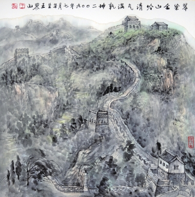 王界山:这幅画运用了传统的技法,以中国式的艺术语言来表达21世纪山水的精神,借鉴了西方的素描之功和对于结构立体组合的方式,强化团块的整体谋篇布局,既有西式的焦墨透视,也有中国传统式的散点透视,在看似矛盾的结构交织中加以有机地组合和协调统一。我没有受制于具象山石的局部约束,发挥了意象精神的表现,将群山连绵的长城,从真正意义上的“远看取其势,近看取其质”的画训中得以笔墨精神的实现。她既有对自然长城的写生之笔,又有意象表现的诗意营造,加之大胆地将整个大幅画面施染金粉,展现了一幅二十一世纪的“金碧长城”,给人以积极向上的力量。