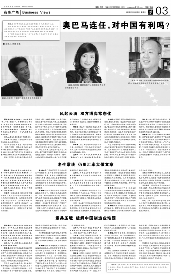 王在邦:从亚洲在世界战略格局中的地位看,奥巴马连任后一定会加大“重返亚洲”的力度。美利用挑起中邻领土领海权益争端,“重返亚洲”难免在某种程度上制约和影响区域经济合作,当然也影响中国区域对外经济关系的发展。而且作为美“重返亚洲”的重头戏,美可能更加卖力地兜售TPP(泛太平洋战略经济伙伴关系协定),力图将其发展成一个排除中国的区域经济合作机制,对中国具有挑战性。