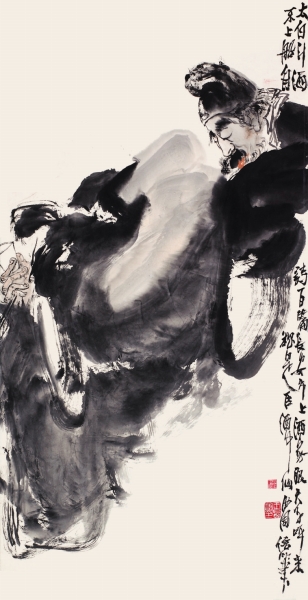 王西洲写意人物画关注的是笔墨与造型的关系,他追求的是一种意象化的造型,即通过与生活物象的接触后,内心形成深刻的感受与体验,从而将这种感悟上升到一种人文的感怀与情感的抒发,再用大写意泼墨的挥洒,去传达一种体现着文化内涵的意象造型,表现一种精神指向。所以我们说,王西洲的大写意人物画是一种精神性的意象造型与表现,他不断突破人们的习惯性审美体验,并力图在盛行的单一“写实”模式的创作方法上取得突破,从而开始强化其艺术个性,并在这种个性中,不断深入与表现主体的“写意”精神,以充沛的创作热情积极地融入到当代的生活和文化的情境中,从而不断寻求与开拓中国大写意人物画发展的新路子。