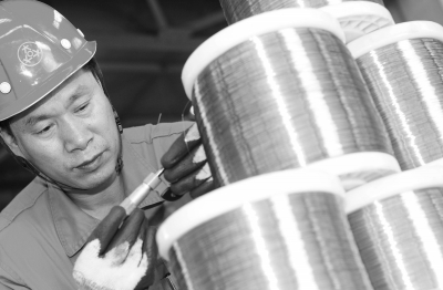 图为东北特钢集团大连基地一名员工检查入库的精细不锈钢丝。