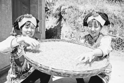 图为3月23日,村民在家门口晾晒滇红花中药材。