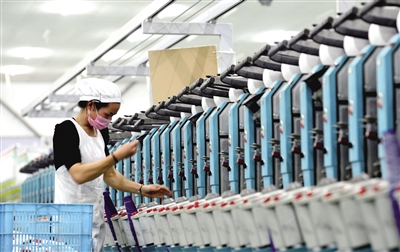近年来,中国纺织名城——河南夏邑县产业集聚区内的大洋纱线公司,主动融入国家“一带一路”倡议,深耕海外市场,提出打造世界第一缝纫线的目标。企业通过技术革新、工艺设备改造等措施,开展产品数量、质量双提升行动。目前,大洋纱线公司拥有52万纱锭的生产规模,年产鑫洋牌纯涤纶缝纫线2万多吨,成为世界最大的缝纫线生产企业,其产品的80%由美国缝纫线经销商巨头们包销。 图为大洋纱线员工在捻线车间作业。 中新社发 苗育才 摄