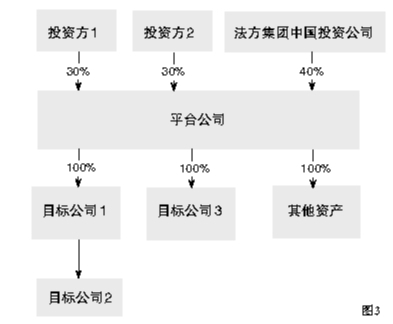 在本方案起初,法方提出由投资方创建一家平台公司作为投资工具,注册资本为三家目标公司估值,并由投资方完成实缴。平台公司向法方股东分别收购目标公司1和目标公司3之60%的股权。