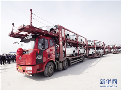 4月20日,装载着200台纯电动汽车的卡车从河南三门峡出发赶往天津,这200台电动汽车将从天津港发运到德国,标志着河南三门峡制造的纯电动汽车进入德国市场。图为在河南三门峡拍摄的准备运往德国的纯电动汽车。 新华社发(杜杰 摄)