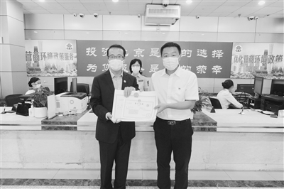 本报讯(记者 刘禹松)9月1日,在北京市朝阳区市场监督管理局登记大厅,中世粮国际认证有限公司负责人王栩男从北京市市场监督管理局登记处处长玄洪波手中接过了全市首张使用市场主体登记确认制方式变更的营业执照。