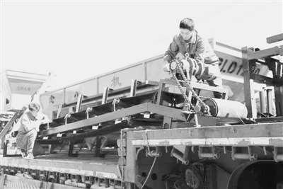 河北廊坊念朋机械设备公司致力于混凝土制品设备技术创新,该公司研发生产的制砖机具有节能环保、操作简便、自动化程度高等优势,可将建筑垃圾、尾矿、河沙等废弃原材料“变身”为新型建材,用于市政、水利、铁路、道路工程、民用建筑领域,深受国内外市场的青睐,产品远销俄罗斯、哈萨克斯坦等多个“一带一路”沿线国家。图为工人正在将刚下线的制砖机装车发货。 贾珺 摄