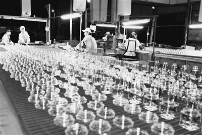 图为安徽省淮北市相山区凤凰山经济开发区安徽金冠玻璃有限责任公司生产线上,工人们正在生产用于出口的玻璃器皿。