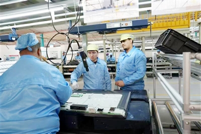 | 2024年8月14日,中方工程师(中)在南非开普敦的海信南非工业园电视机生产线上指导当地员工工作。工业园已为当地创造1000多个直接就业机会、5000多个间接就业岗位,带动地区产业链发展。 新华社发 |